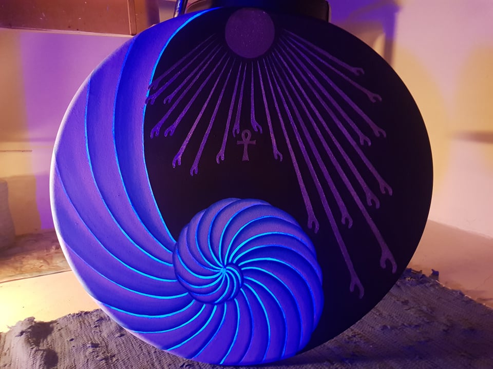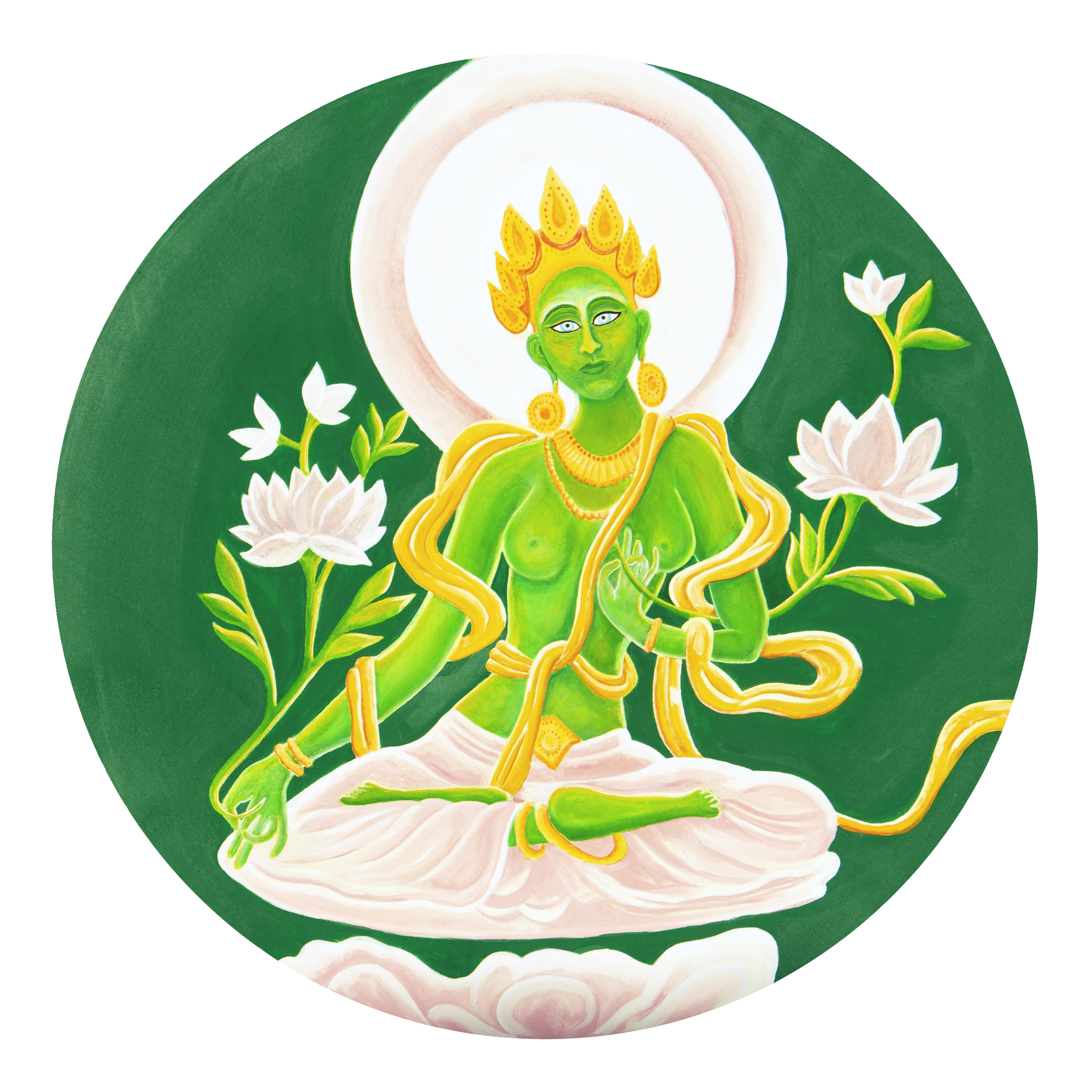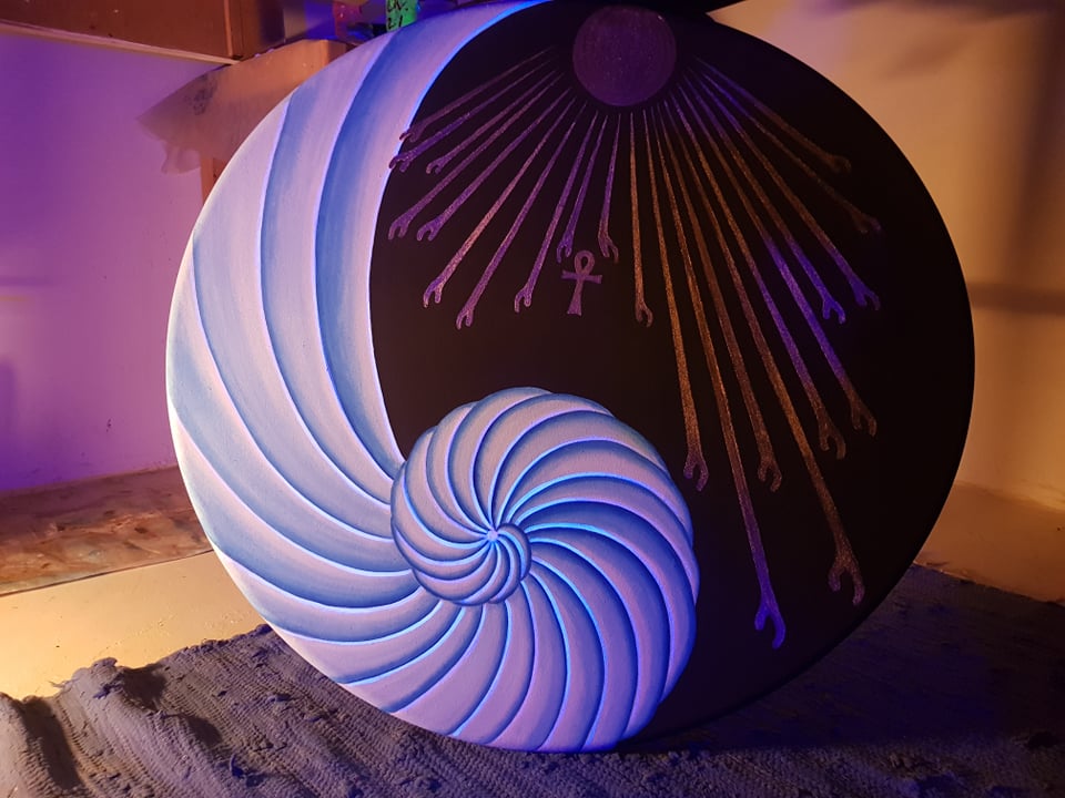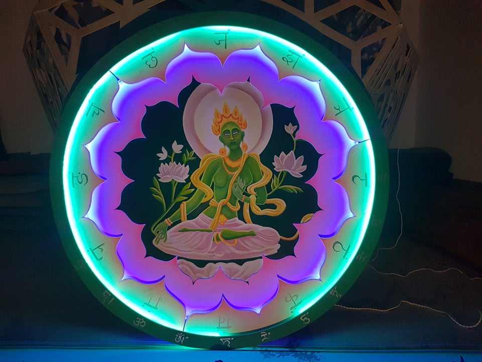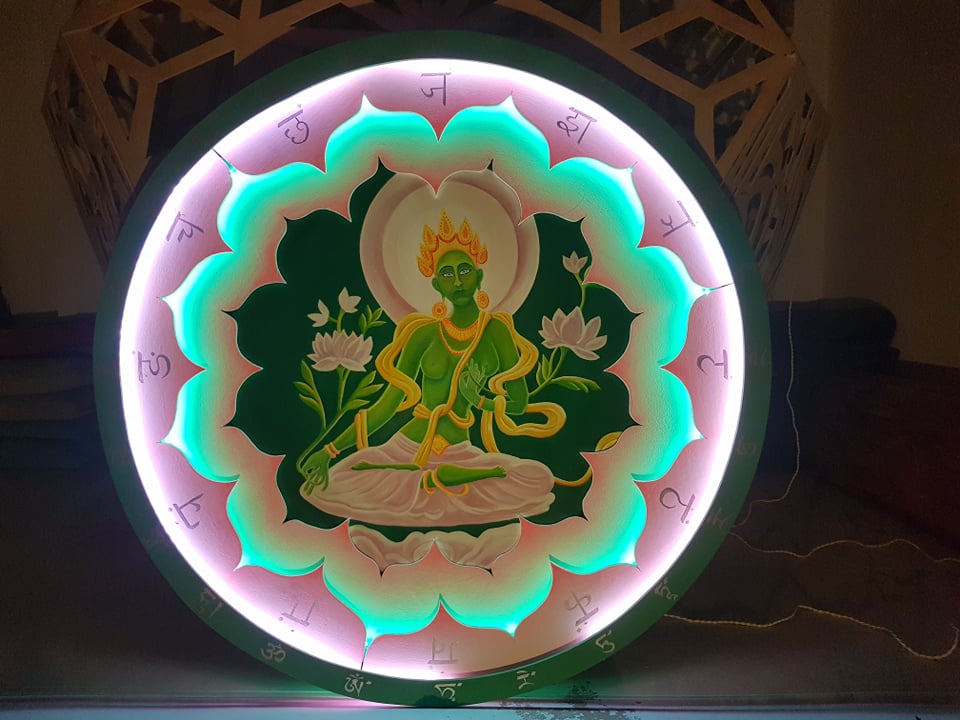 A green Tara, painted over a period of 11 months. Complete with a three level frame of petals and LED lighting. Sanskrit mantras painted on the frame. A True blessing of love and awakening. Acrylic, UV and metallic paints, on high quality cotton canvas. Painting 770 mm, with frame 1180 mm diameter. For full photo gallery please see the Art page, or contact us directly for more information.