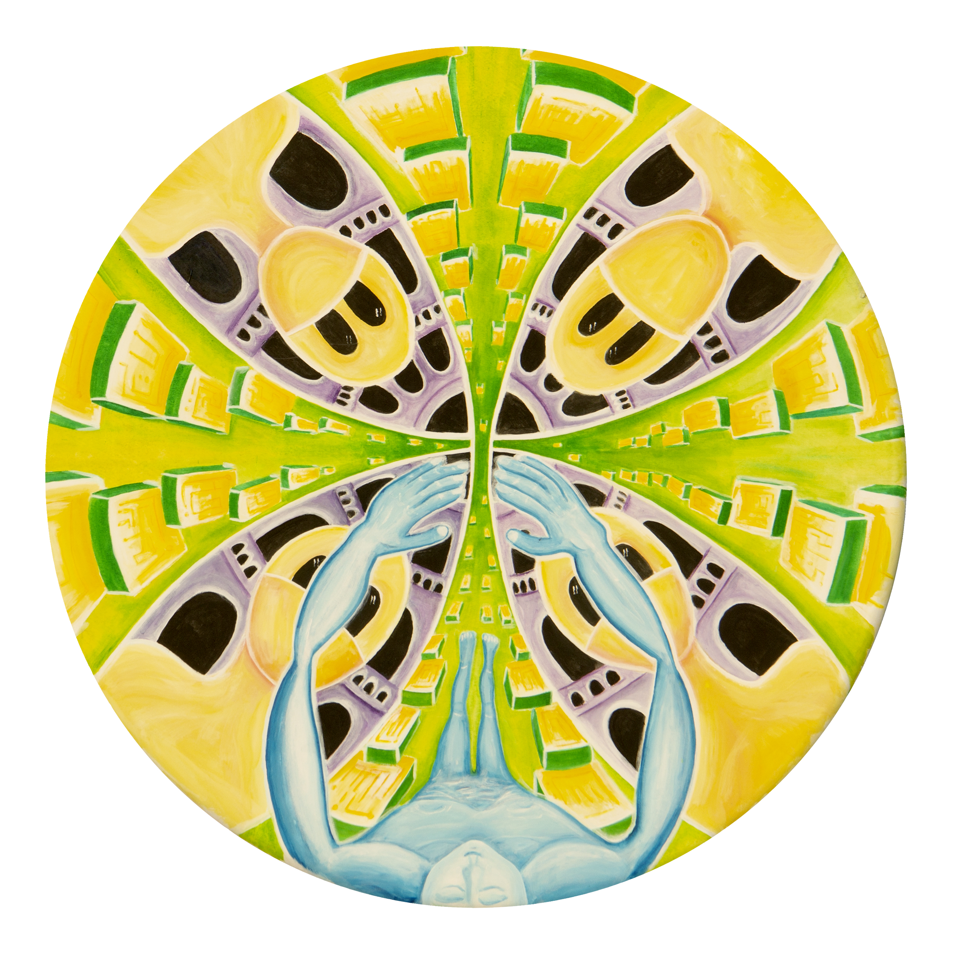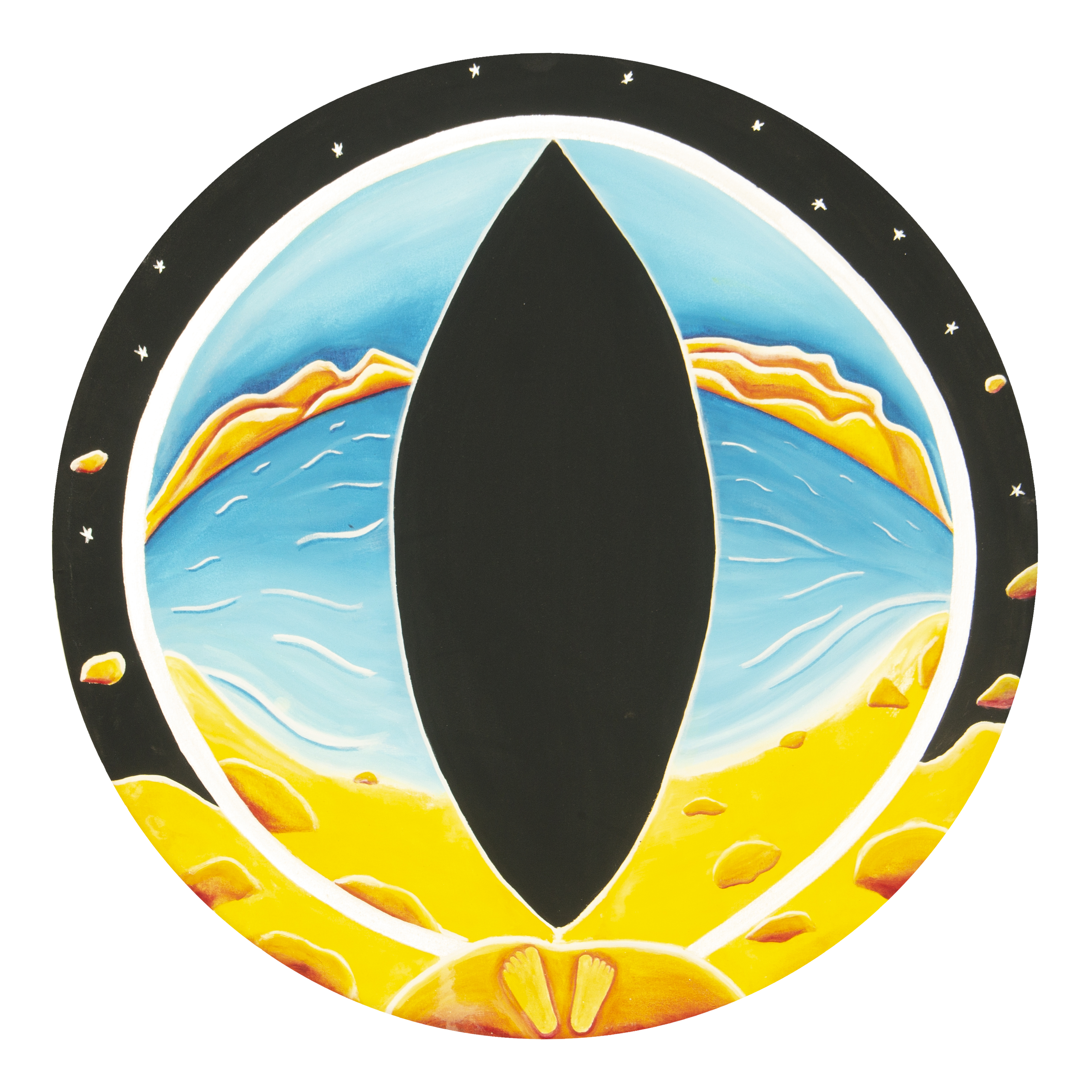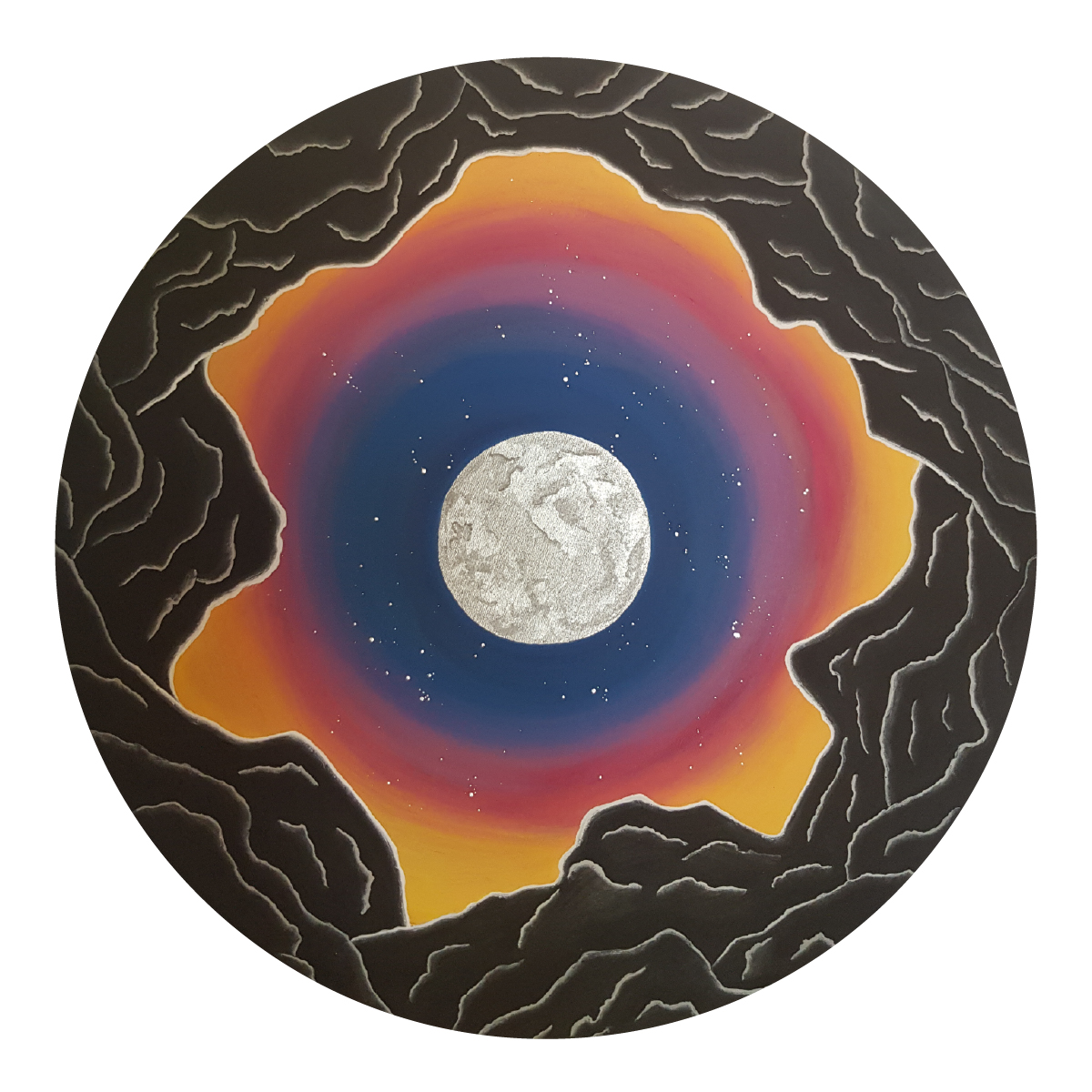 Acrylic and metallic paints, on high quality cotton canvas. 770 mm diameter. For full photo gallery please see the Art page, or contact directly for more information.